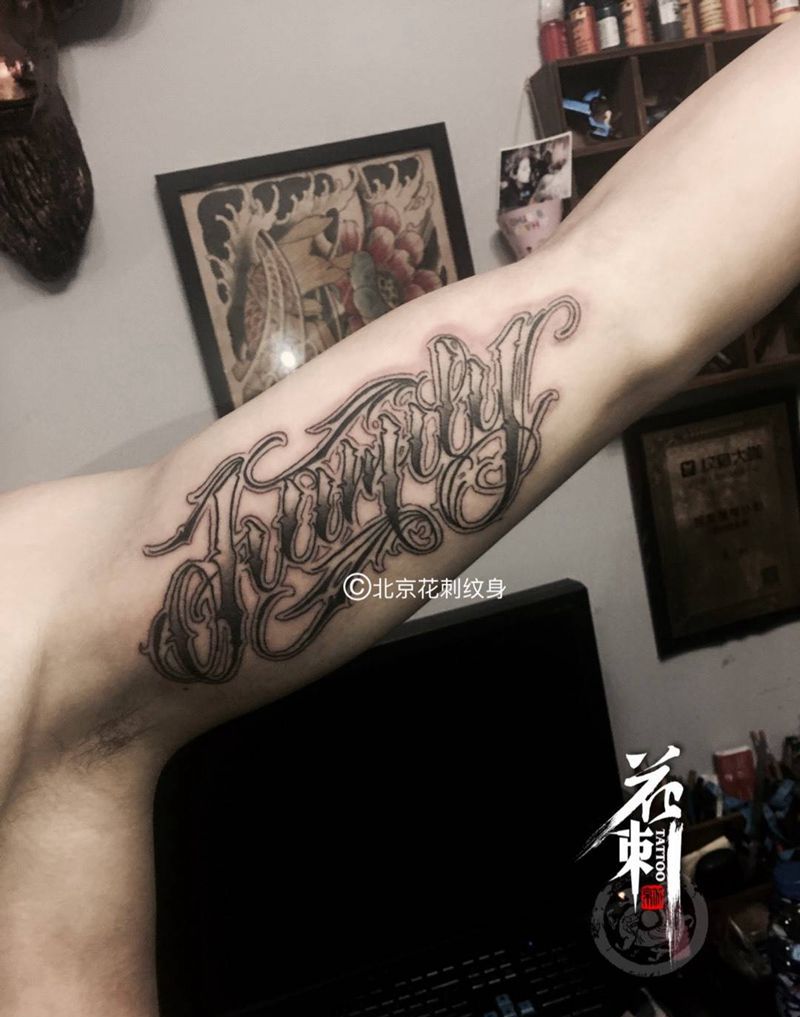 当前位置: 首页 >北京市纹身店-北京花刺纹身工作室纹身图案>花体family纹身图片_手臂欧美清新字符纹身图案