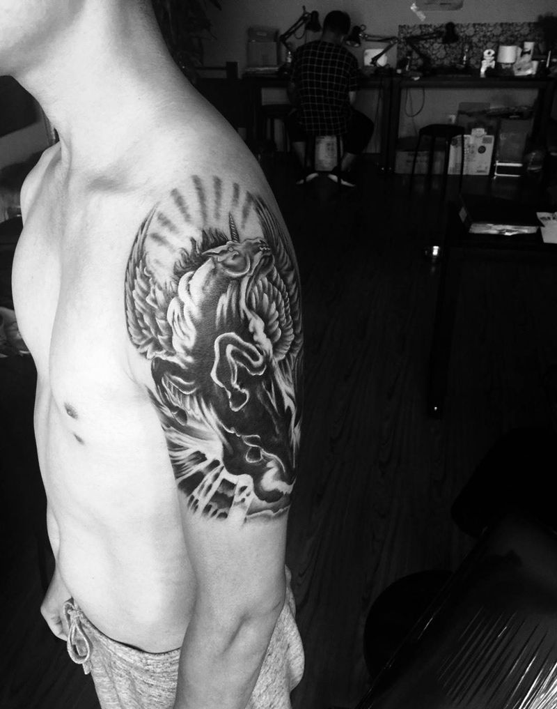 当前位置: 首页 >北京市纹身店-北京花刺纹身工作室纹身图案>天马行空纹身图片_成品手臂欧美写实动物纹身图案