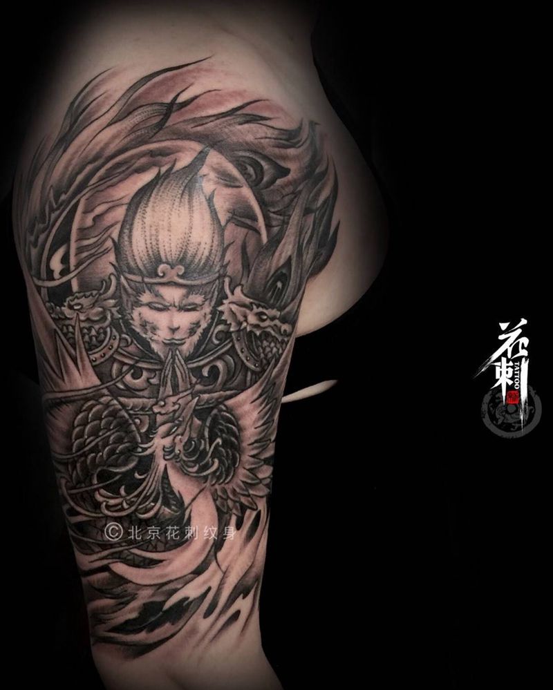 当前位置: 首页 >北京市纹身店-北京花刺纹身工作室纹身图案>【封“凤”侯“猴”拜相】纹身图片_成品手臂传统动物人物宗教纹身图案