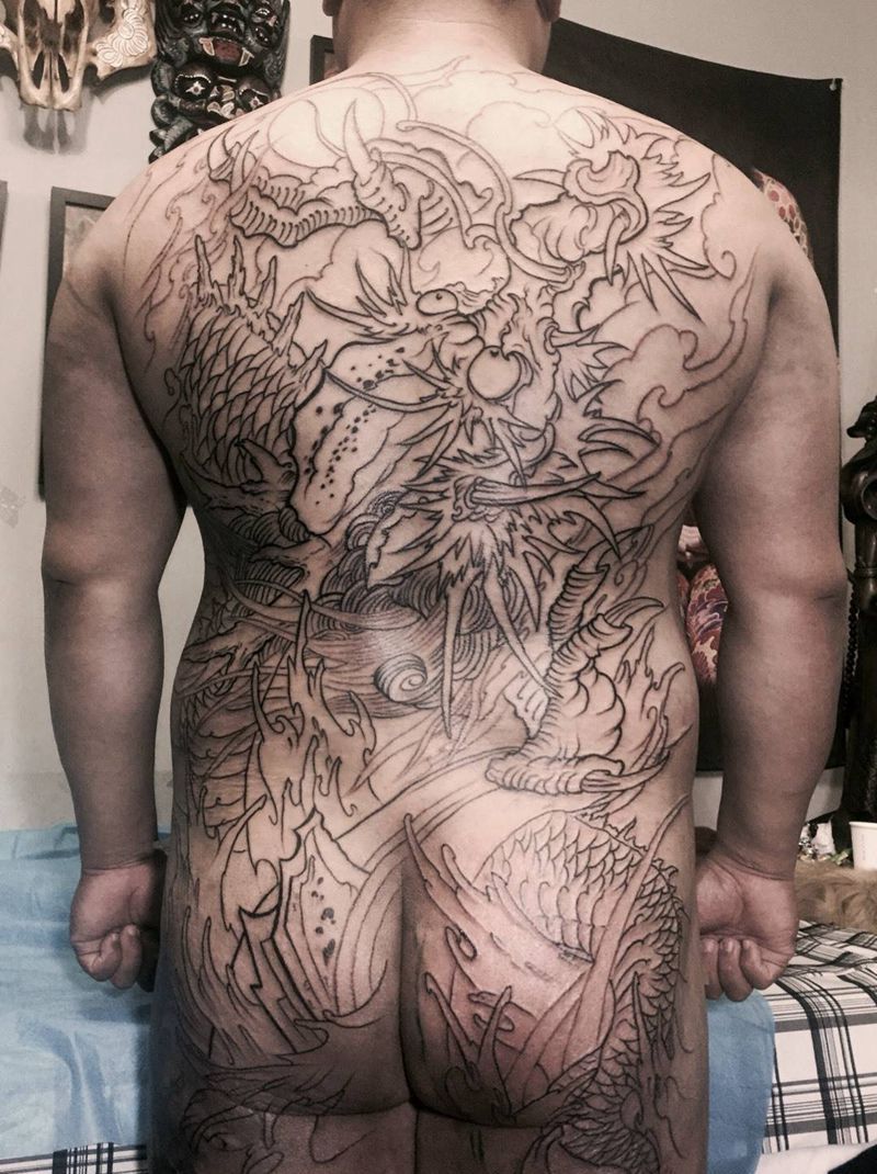 当前位置: 首页 >北京市纹身店-北京花刺纹身工作室纹身图案>满背龙割线!纹身图片_背部臀部腿部传统动物纹身图案