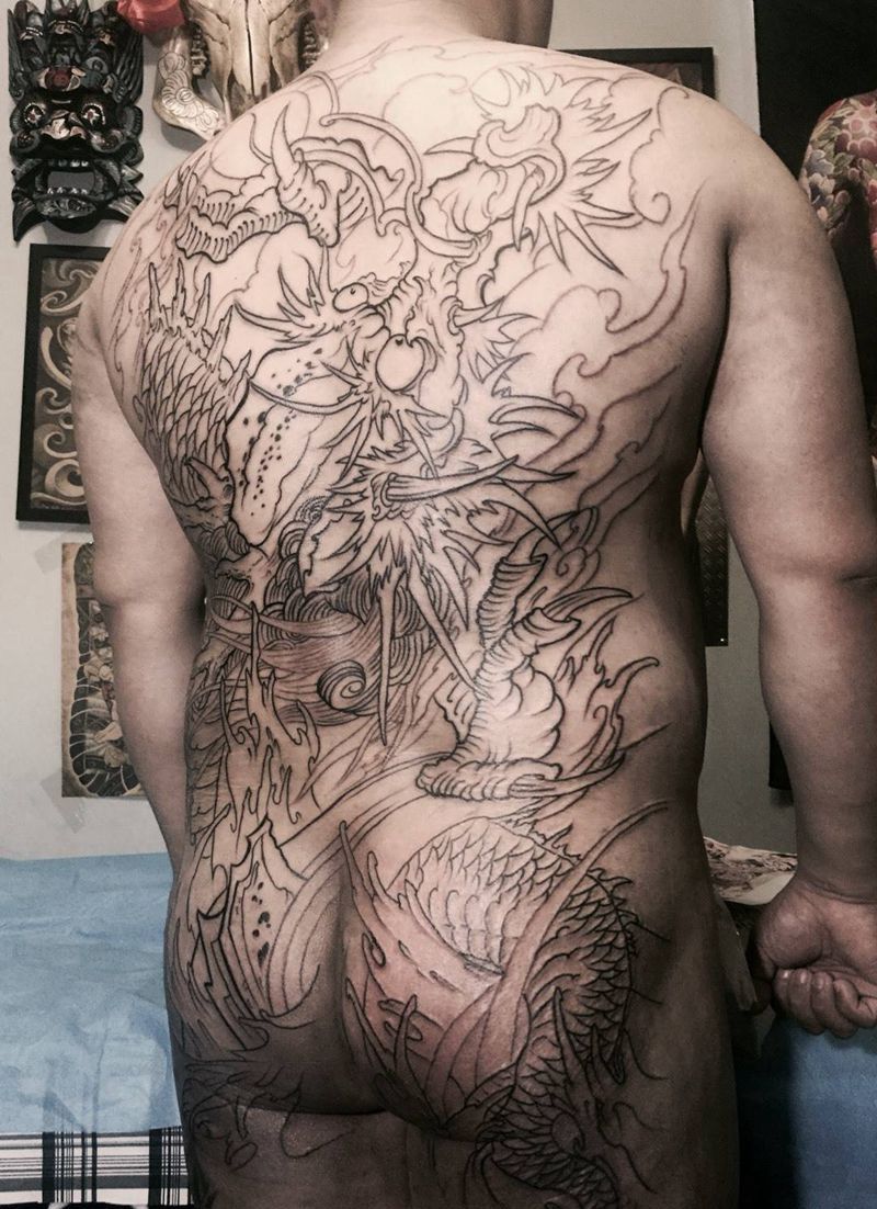 当前位置: 首页 >北京市纹身店-北京花刺纹身工作室纹身图案>满背龙割线!纹身图片_背部臀部腿部传统动物纹身图案