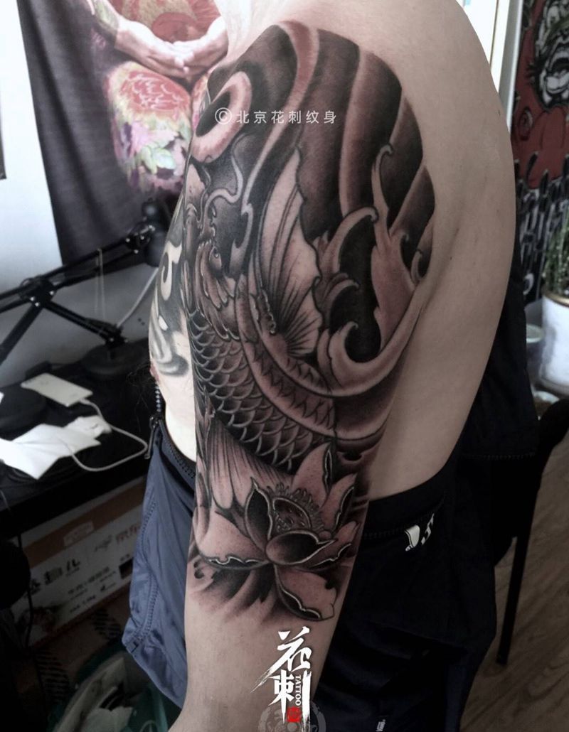 当前位置: 首页 >北京市纹身店-北京花刺纹身工作室纹身图案>大臂鲤鱼纹身图片_成品手臂传统动物纹身图案