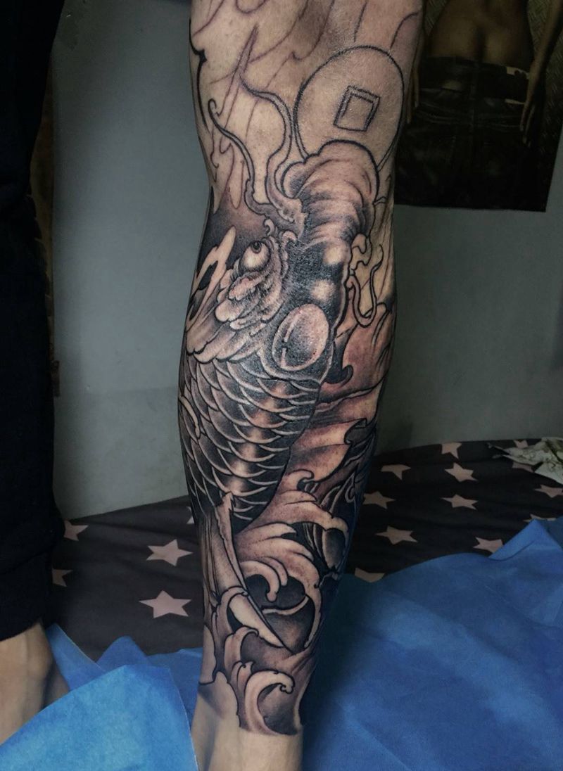 • T网红王老大花腿龙纹身图片_腿部新传统纹身图案