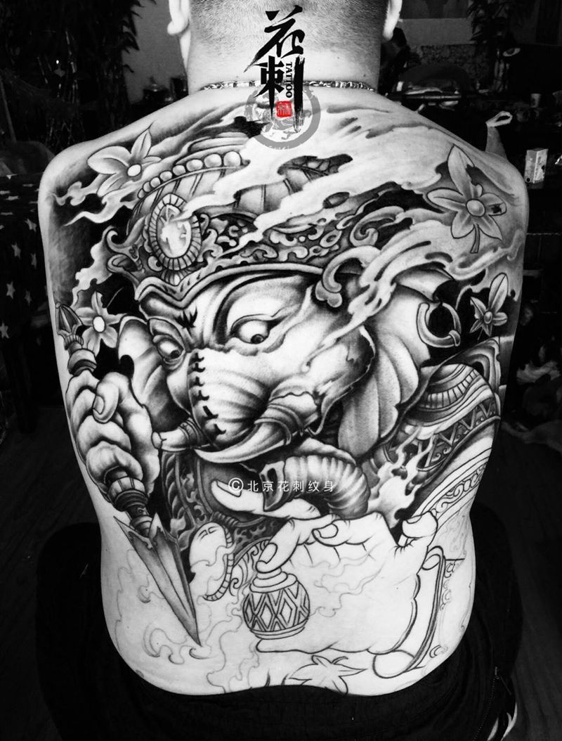 当前位置: 首页 >北京市纹身店-北京花刺纹身工作室纹身图案>满背象神未完成!纹身图片_背部传统动物宗教人物纹身图案