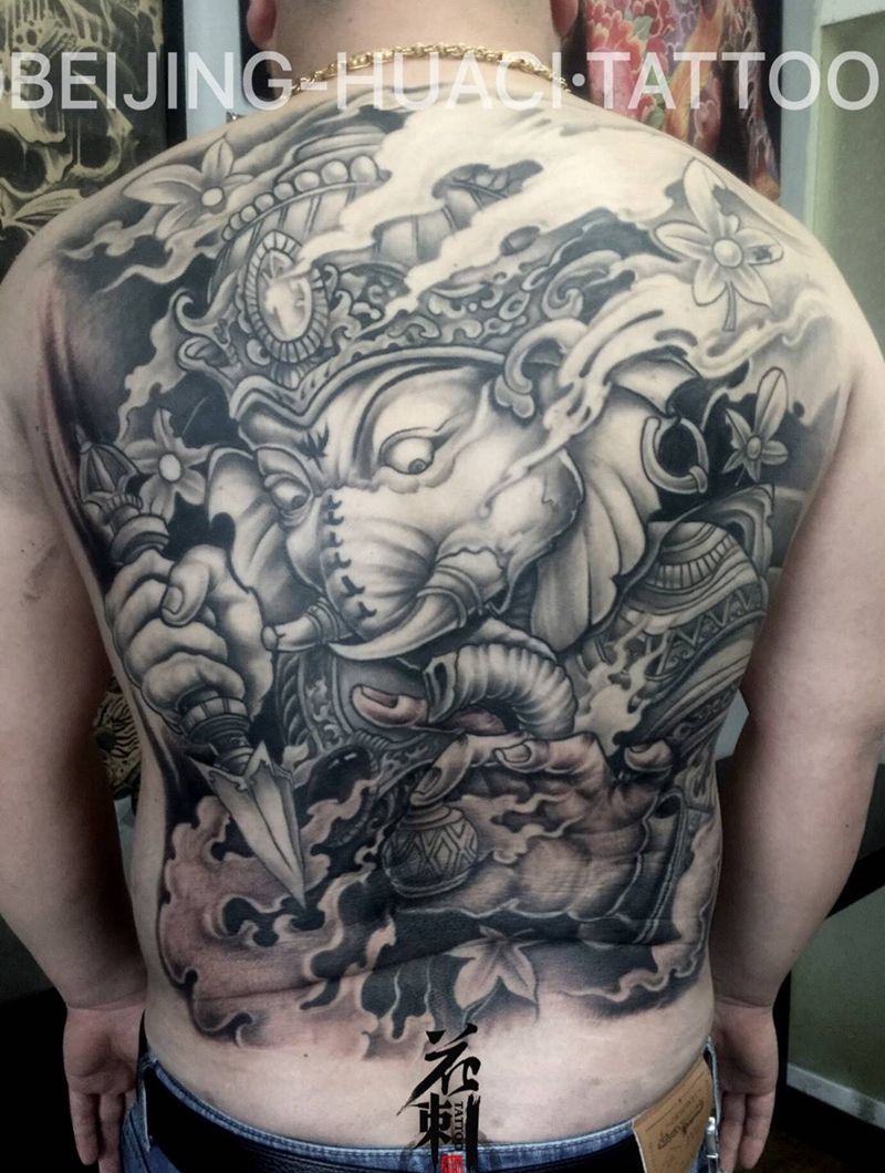 当前位置: 首页 >北京市纹身店-北京花刺纹身工作室纹身图案>满背象神纹身图片_成品背部传统动物人物宗教纹身图案