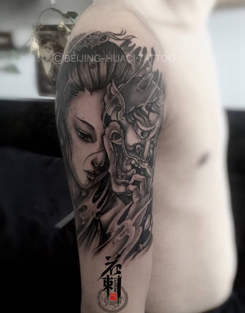 当前位置: 首页 >北京市纹身店-北京花刺纹身工作室纹身图案>艺妓般若纹身图片_成品手臂传统人物鬼神纹身图案