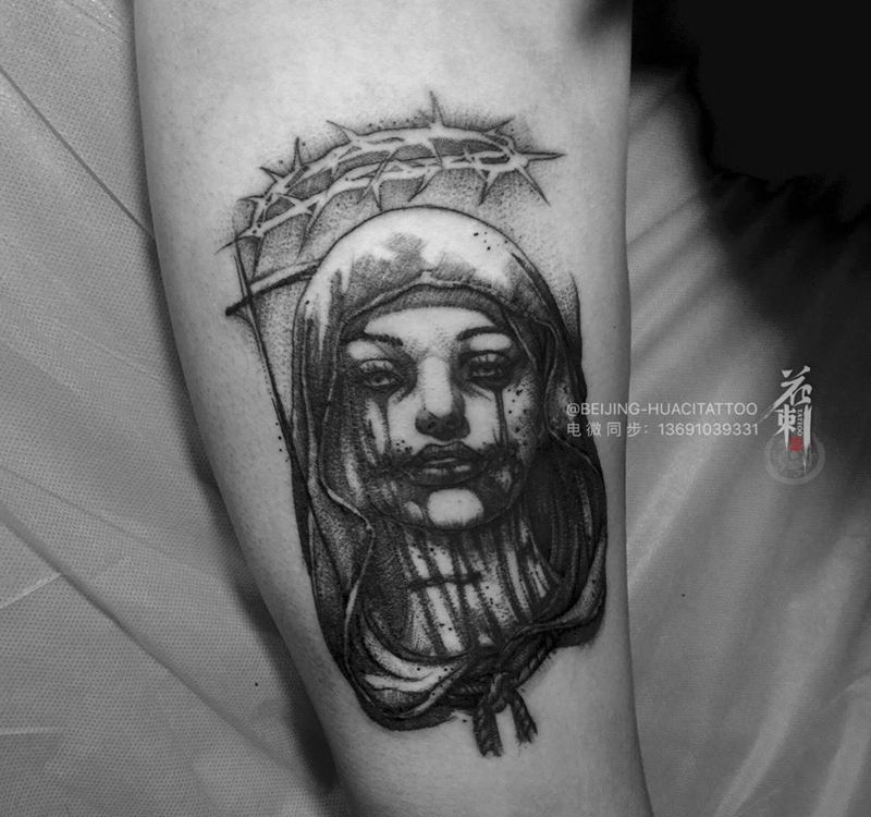 当前位置: 首页 >北京市纹身店-北京花刺纹身工作室纹身图案>暗黑玛利亚纹身图片_腿部欧美写实点刺纹身图案