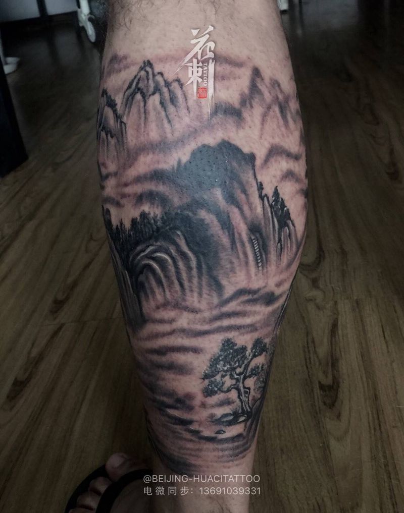 当前位置: 首页 >北京市纹身店-北京花刺纹身工作室纹身图案>国画风山水图!纹身图片_成品腿部传统国画静物植物纹身图案