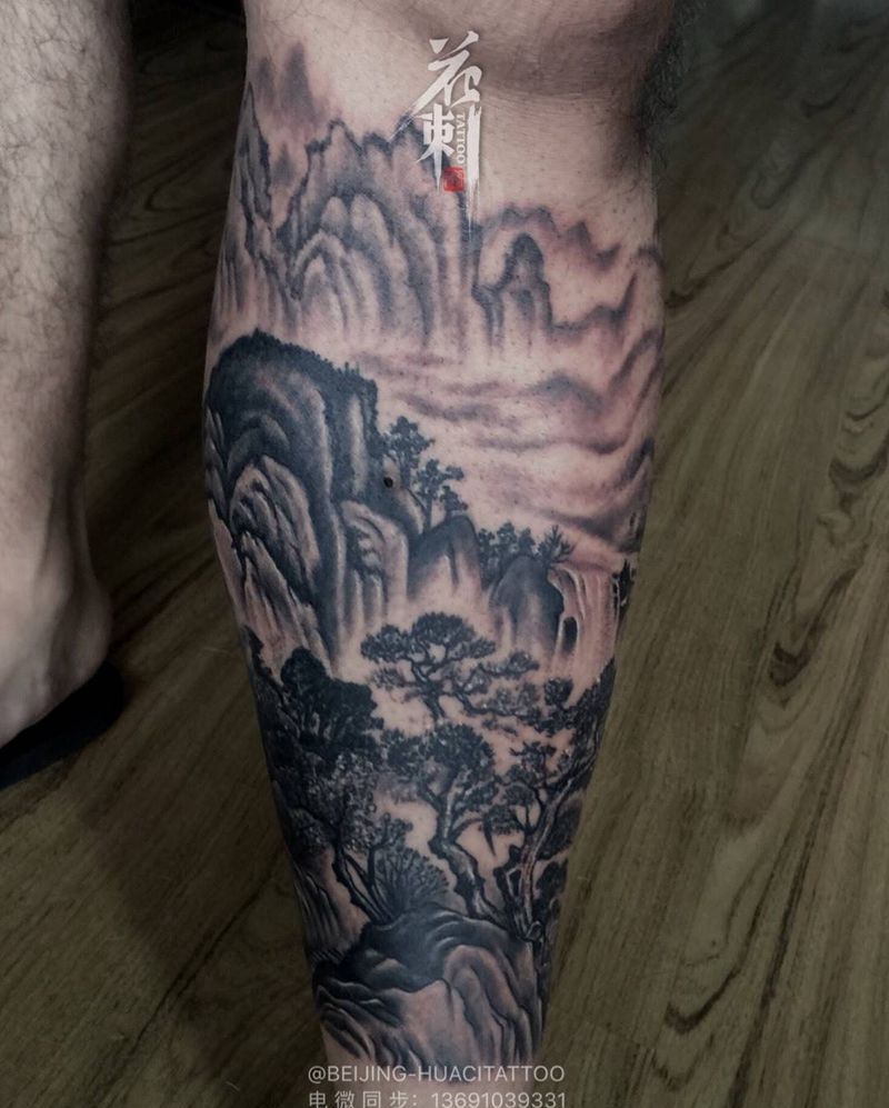 当前位置: 首页 >北京市纹身店-北京花刺纹身工作室纹身图案>国画风山水图!纹身图片_成品腿部传统国画静物植物纹身图案