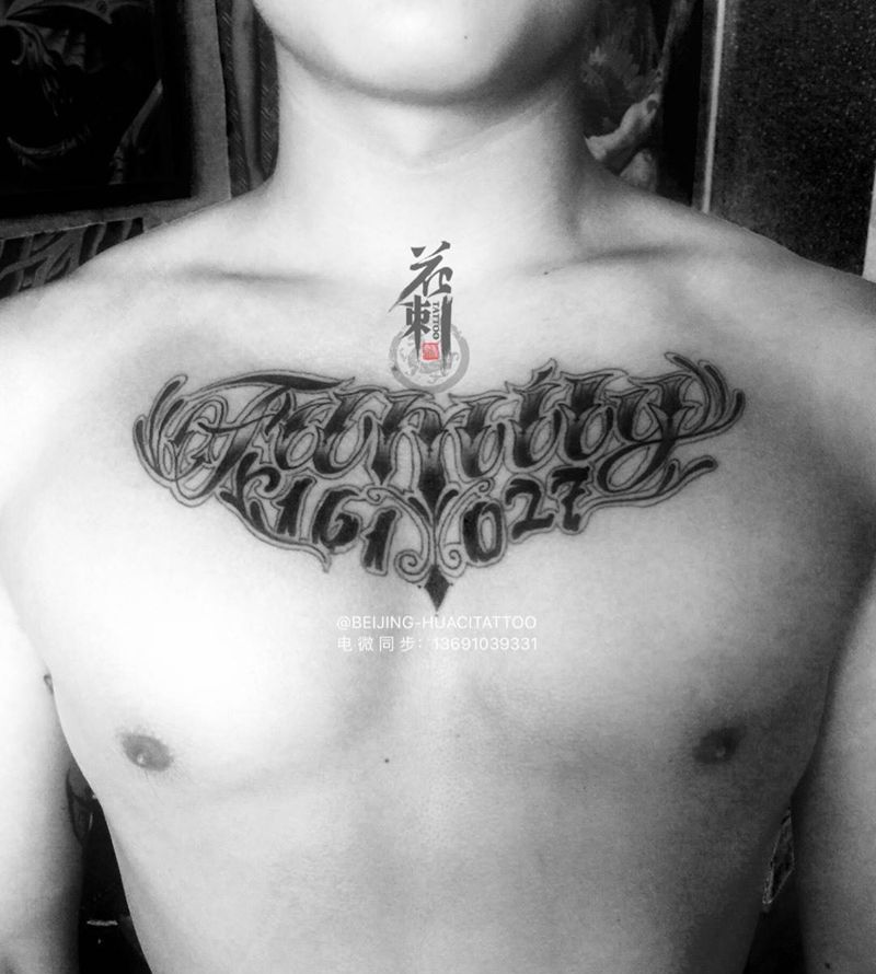 小花胸小花体纹身图片_胸部花体字纹身图案