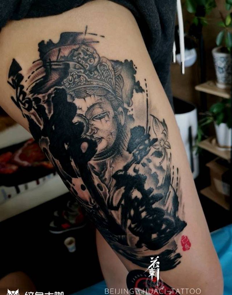 為佛無魔纹身图片_腿部水墨书法佛魔纹身图案