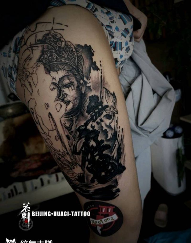 【為佛•無魔】纹身图片_腿部水墨新传统纹身图案