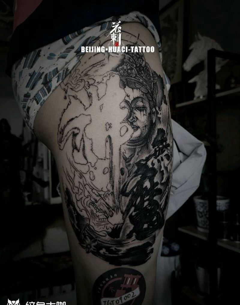 【為佛•無魔】纹身图片_腿部水墨新传统纹身图案