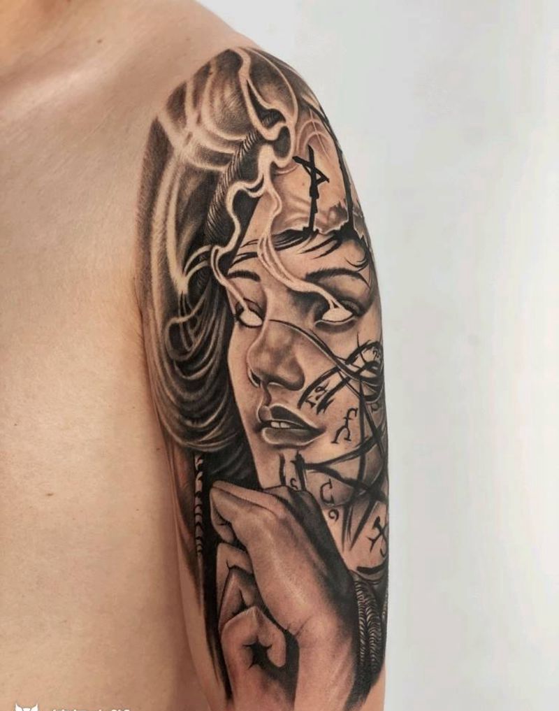 当前位置: 首页 >北京市纹身店-墨研纹身纹身图案>眼熟纹身图片_手臂欧美写实女人头宗教纹身图案