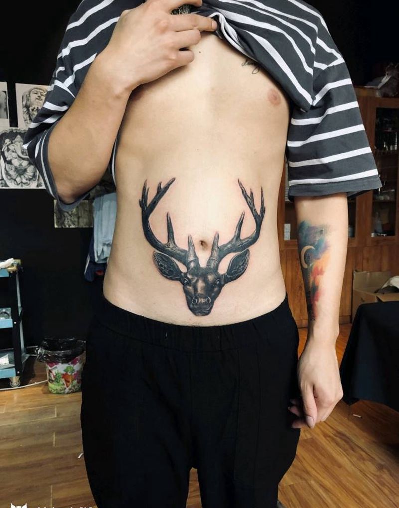 铁头鹿纹身图片_腹部欧美写实金属纹身图案