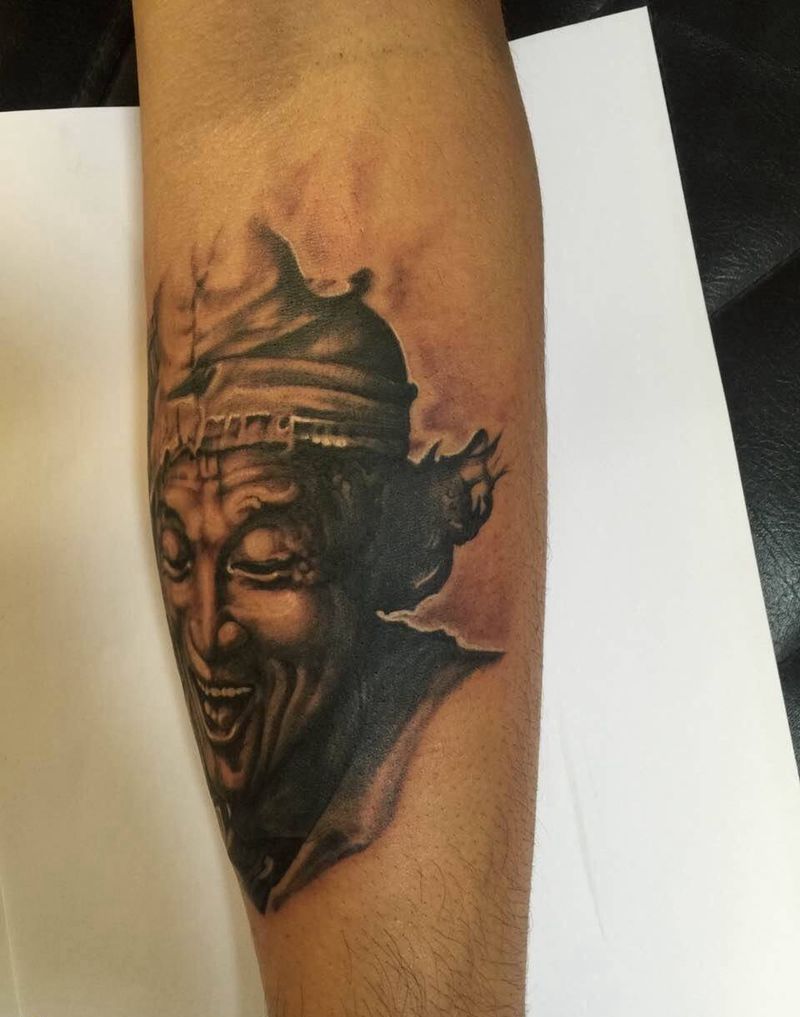 • T包小腿吹火男+阿多福纹身图片_腿部老传统新传统吹火男阿