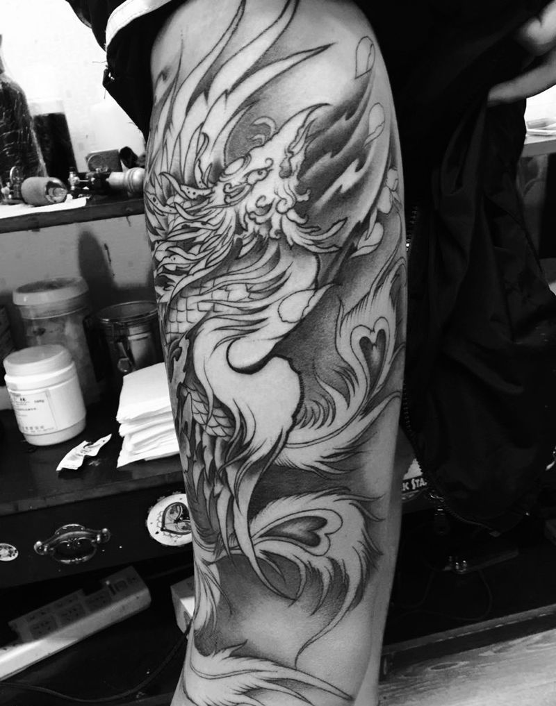 • T网红王老大花腿龙纹身图片_腿部新传统纹身图案