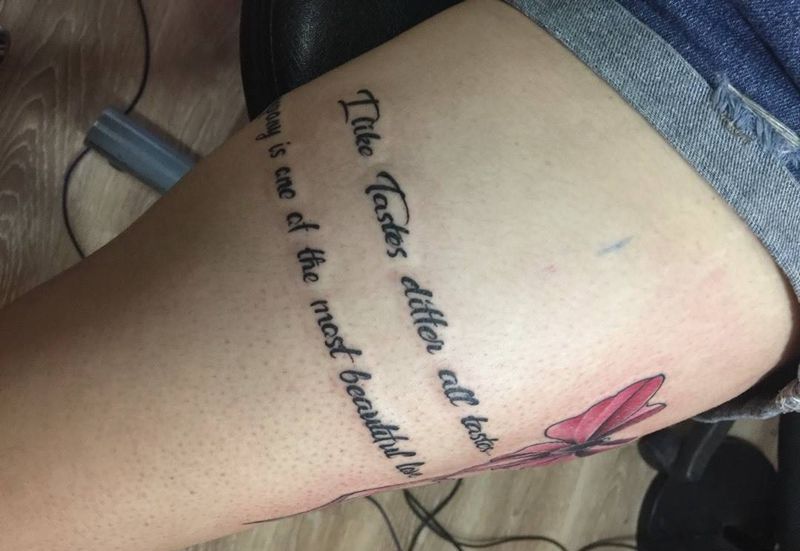 当前位置: 首页 >北京市纹身店-北京针刺纹身纹身图案>蝴蝶结加英文纹身图片_