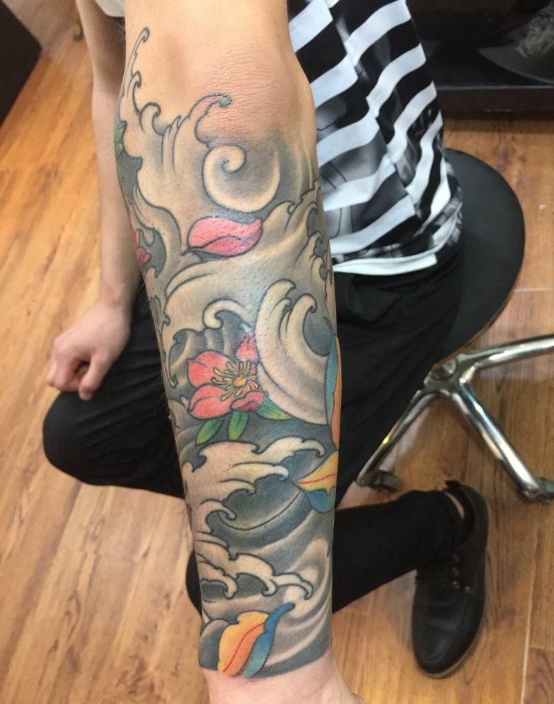 当前位置: 首页 >北京市纹身店-北京针刺纹身纹身图案>荷花水浪包小臂纹身图片_