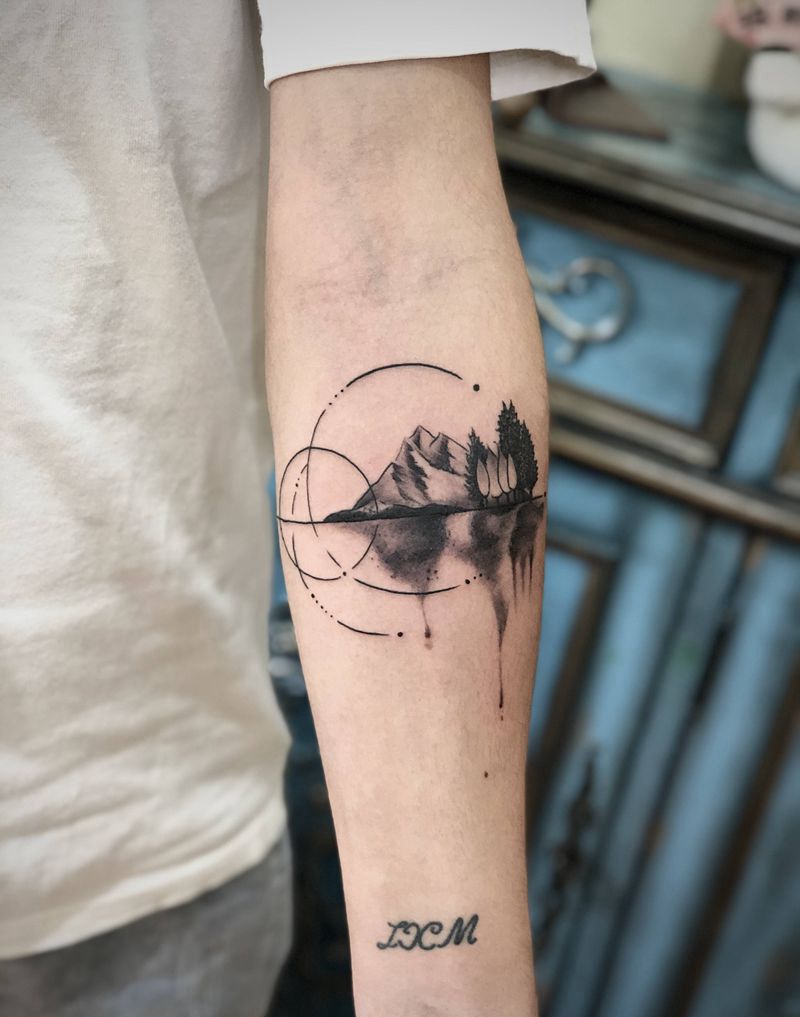 当前位置: 首页 >北京市纹身店-北京针刺纹身纹身图案>几何山水纹身图片_手臂水墨几何纹身图案