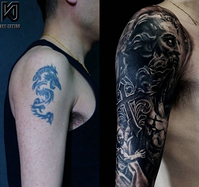 花臂衔接纹身图片_手臂欧美写实遮盖纹身图案
