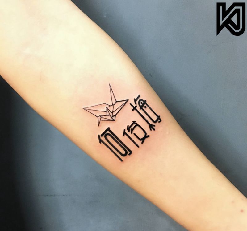 当前位置: 首页 >北京市纹身店-空间•ART•TATTOO STUDIO纹身图案>千纸鹤•汉字纹身图片_手臂花体字千纸鹤纹身图案