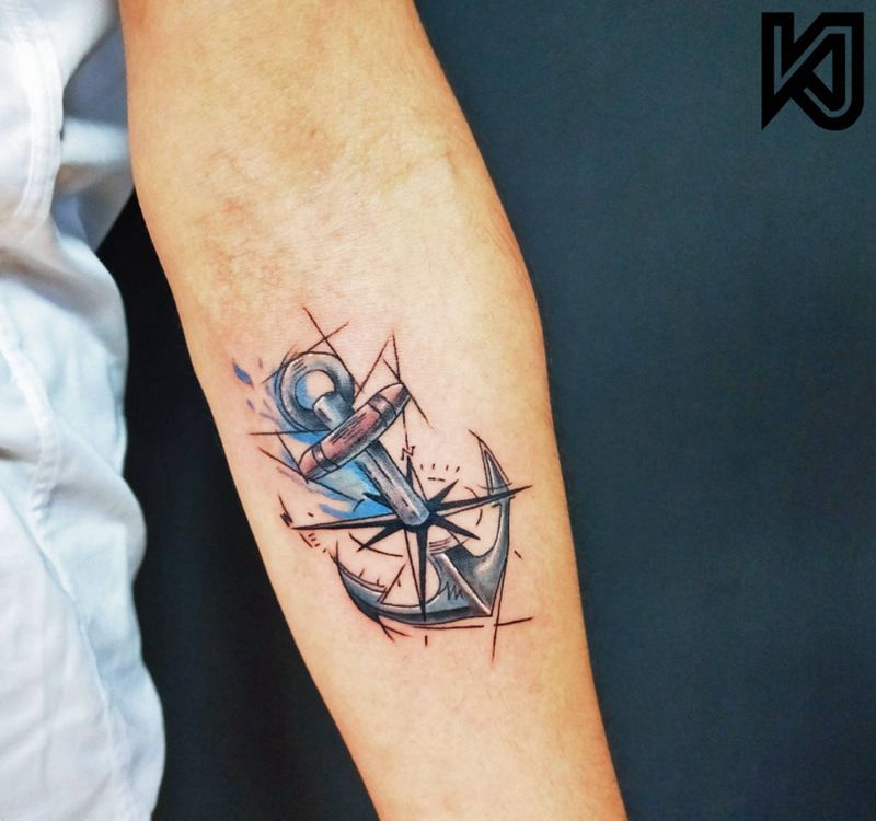 船锚•指南针纹身图片_手臂水彩纹身图案