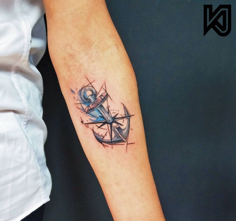 船锚•指南针纹身图片_手臂水彩纹身图案