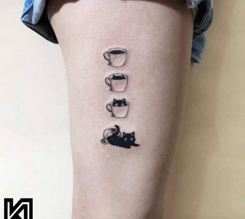 咖啡猫纹身图片_腿部水墨纹身图案