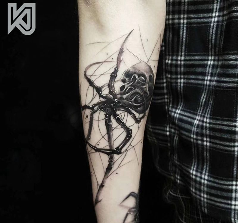 当前位置: 首页 >北京市纹身店-空间•ART•TATTOO STUDIO纹身图案>骷髅蜘蛛纹身图片_手臂欧美写实纹身图案