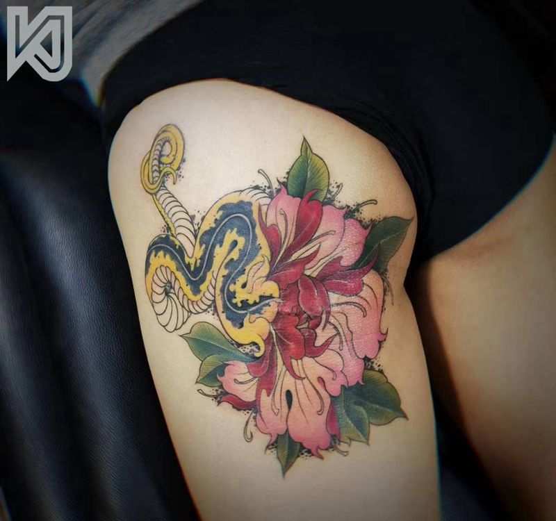 蛇戏牡丹纹身图片_臀部新传统蛇牡丹纹身图案