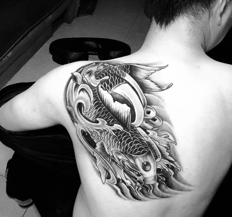 后背鲤鱼纹身图片_成品背部传统动物纹身图案