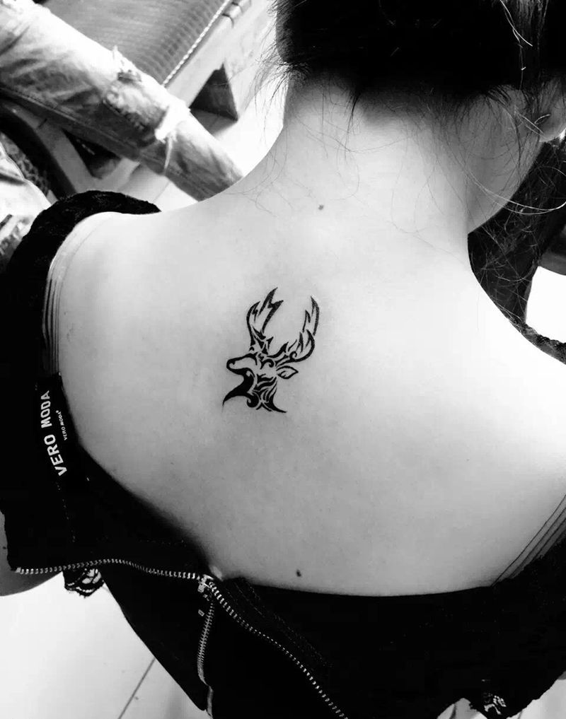 鹿头纹身图片_成品颈部欧美动物纹身图案