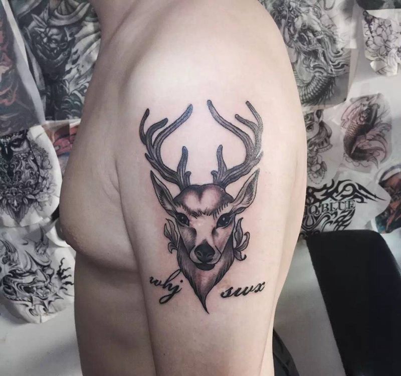 当前位置: 首页 >北京市纹身店-北京花刺纹身工作室纹身图案>大臂鹿头完成纹身图片_
