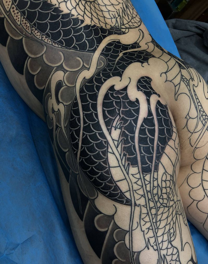 • T网红王老大花腿龙纹身图片_腿部新传统纹身图案