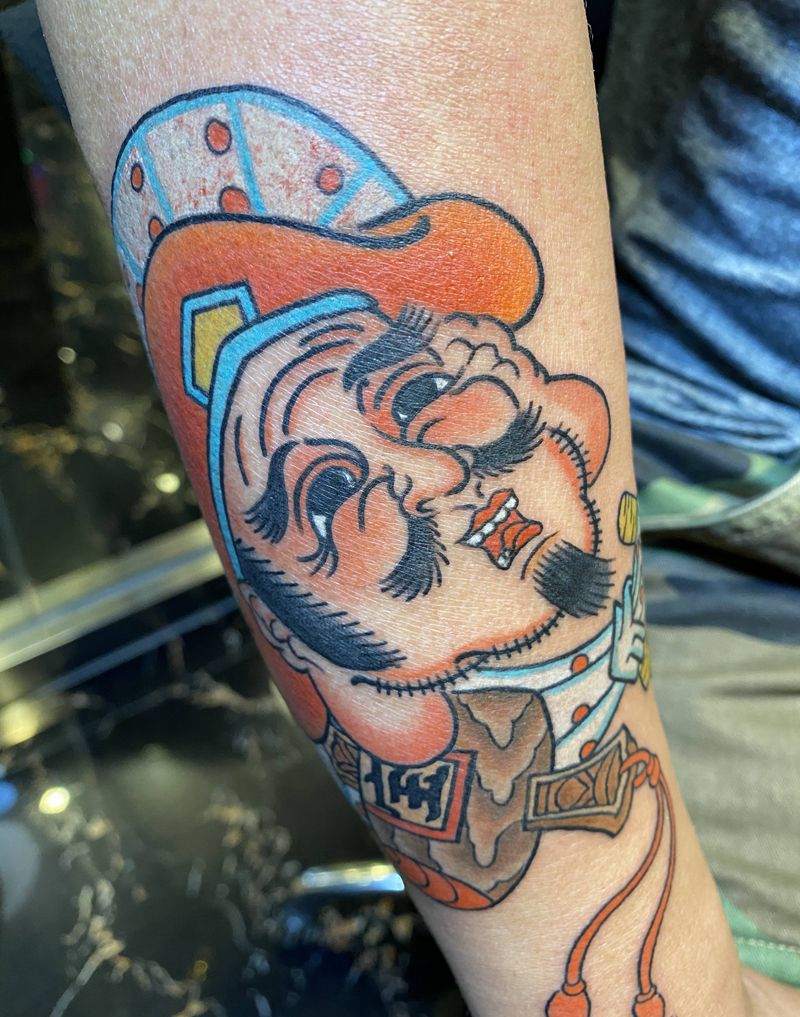 • T包小腿吹火男+阿多福纹身图片_腿部老传统新传统吹火男阿
