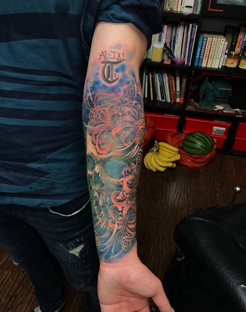 遮盖 彼岸花开纹身图片_成品欧美写实原创植物手臂纹身图案