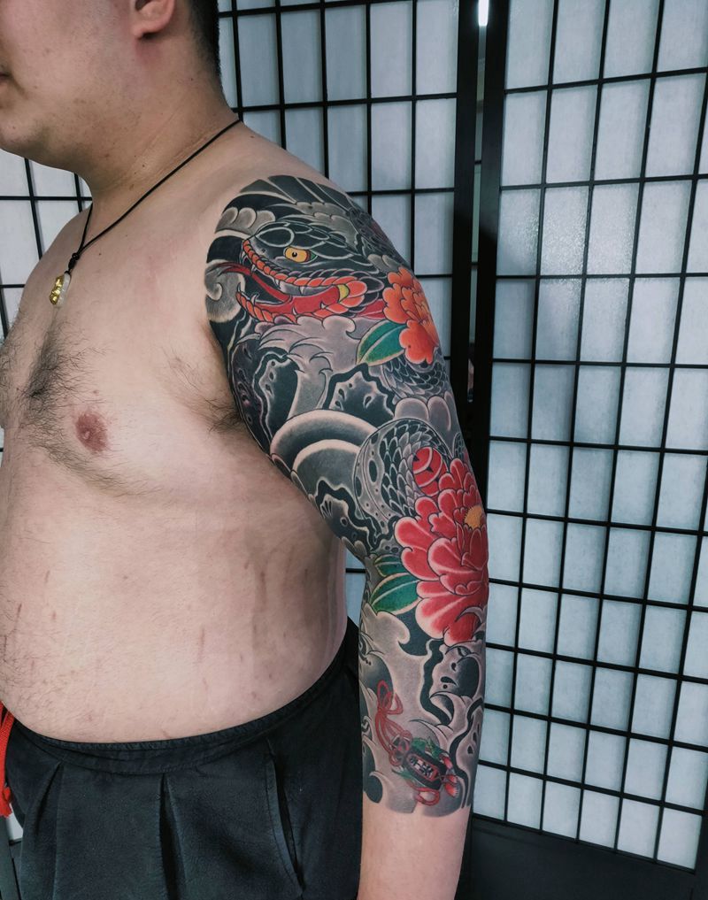 当前位置: 首页 >北京市纹身店-小松刺青工作室纹身图案>老传统富贵牡丹蛇八分袖纹身图片_手臂老传统蛇牡丹八分袖纹身图案