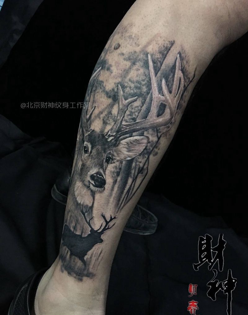 当前位置: 首页 >北京市纹身店-财神纹身工作室纹身图案>鹿纹身图片_成品欧美动物写实腿部纹身图案