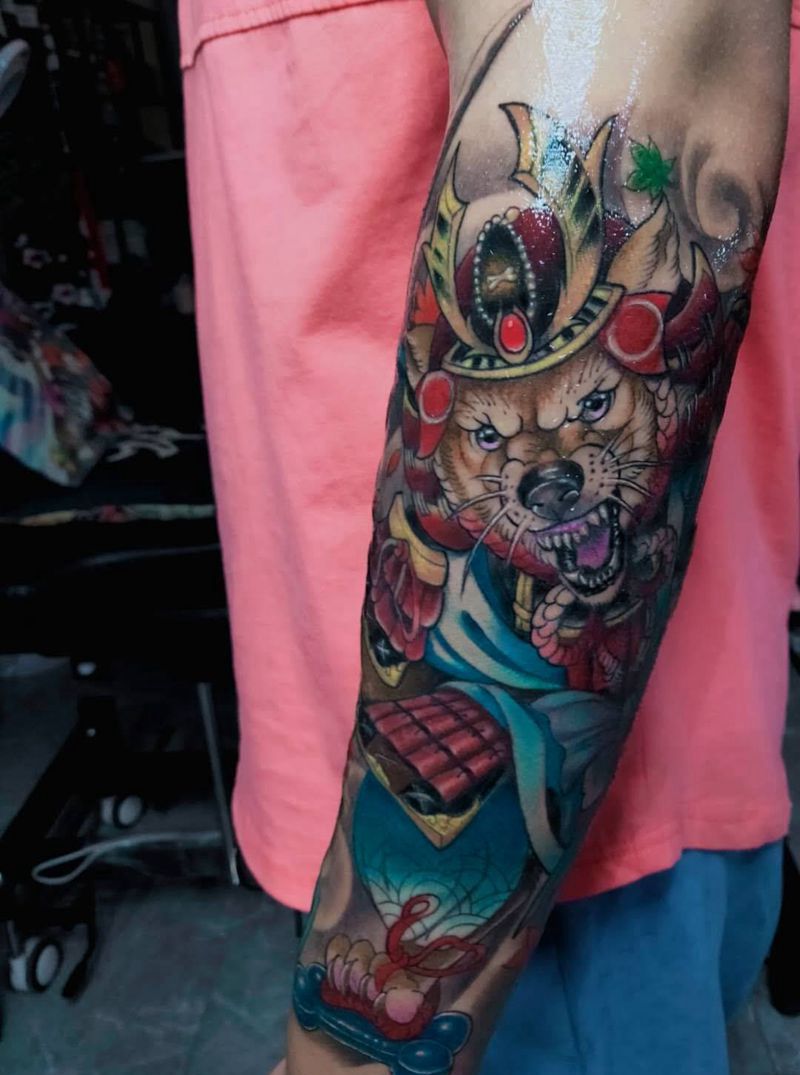 当前位置: 首页 >北京市纹身店-小松刺青工作室纹身图案>传统武士狗!完成纹身图片_手臂新传统纹身图案