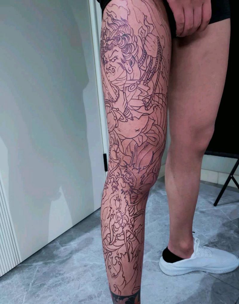 • T网红王老大花腿龙纹身图片_腿部新传统纹身图案