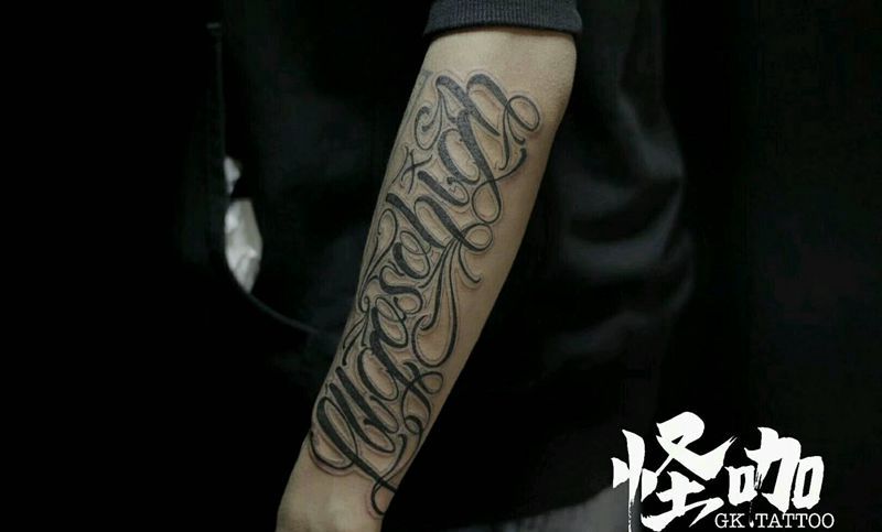 当前位置: 首页 >天津市纹身店-怪咖纹身刺青纹身图案>花体字纹身图片_颈部胸部腹部手臂腿部脚部欧美花体字成品纹身图案