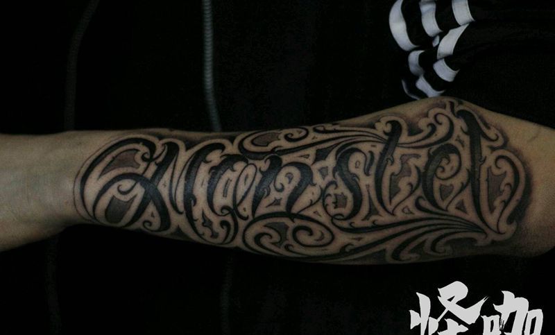 当前位置: 首页 >天津市纹身店-怪咖纹身刺青纹身图案>花体字纹身图片_手臂欧美字符花体字成品纹身图案
