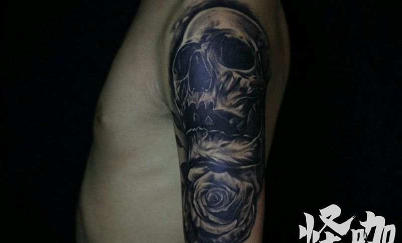 当前位置: 首页 >天津市纹身店-怪咖纹身刺青纹身图案>黑白写实骷髅纹身图片_手臂欧美写实鬼神原创成品纹身图案