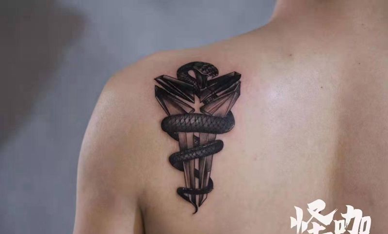 黑曼巴纹身图片_背部几何欧美写实纹身图案