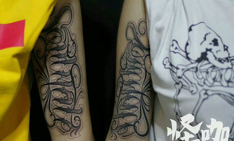 花体字纹身图片_手臂字符情侣成品纹身图案