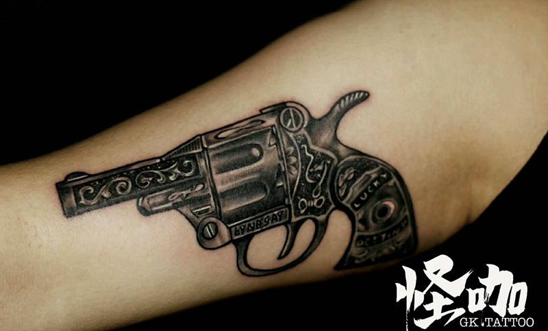 当前位置: 首页 >天津市纹身店-怪咖纹身刺青纹身图案>左轮纹身图片_手臂欧美写实原创成品纹身图案