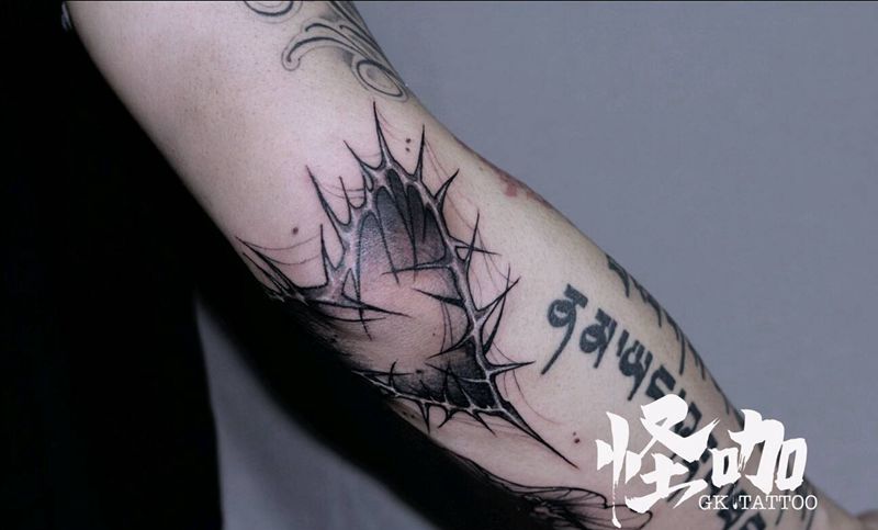 当前位置: 首页 >天津市纹身店-怪咖纹身刺青纹身图案>暗黑爆肘纹身图片_手臂纹身图案