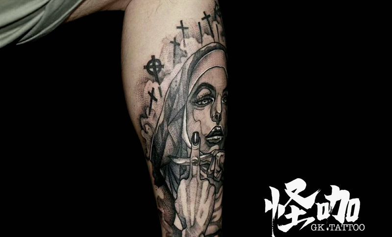 当前位置: 首页 >天津市纹身店-怪咖纹身刺青纹身图案>暗黑修女纹身图片_腿部纹身图案