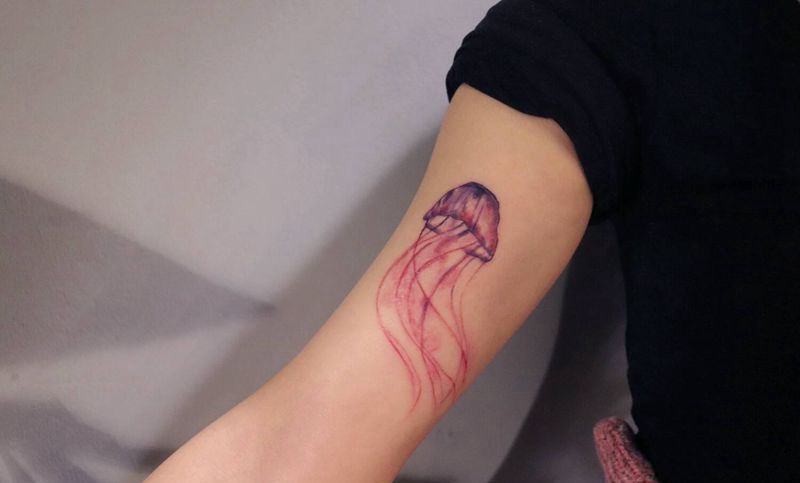 当前位置: 首页 >天津市纹身店-怪咖纹身刺青纹身图案>水母纹身图片_手臂水彩纹身图案